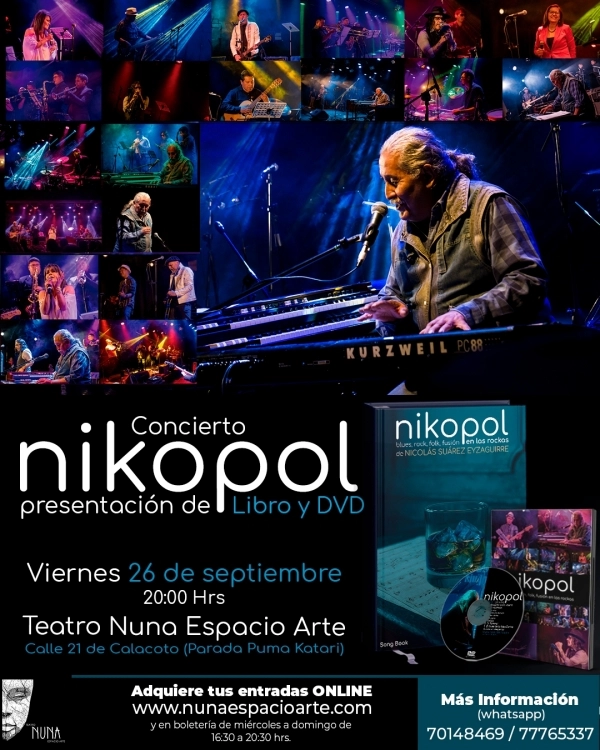 Nikopol celebra la presentación de su libro de partituras, que reúne todo su repertorio y el DVD de su concierto. Serán 10 años en una velada muy especial. La agrupación está conformada por Chubi, Vic, Fabbat y Nikopol, junto a otros invitados.