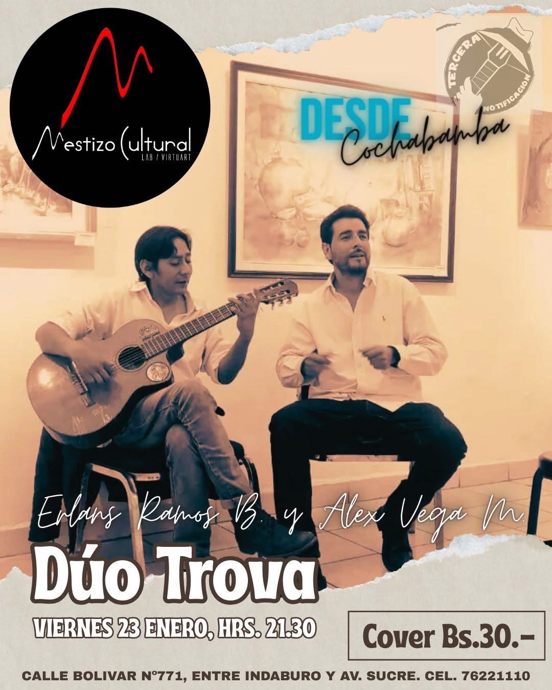 Desde Cochabamba Erlans Ramos B. & Alex Vega M., un dúo con ocho años de trayectoria, llevando la esencia de la música con contenido en cada escenario. Voces y guitarras que se fusionan en un viaje musical para reflexionar, soñar y sentir.