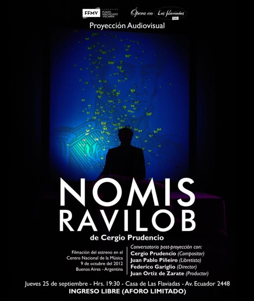 Proyección de la ópera de cámara Nomis Ravilob, de Cergio Prudencio, inspirada en Mi delirio en el Chimborazo, de Simón Bolívar. En esta obra, el Libertador transita un paraje mítico andino regido por cuatro animales sagrados: el cóndor, la vicuña, la serpiente y el puma. Cada uno lo confronta con su destino, sus ausencias y su propia sombra, hasta llevarlo a difuminarse en los manantiales profundos de la tierra que libertó. La grabación que se verá corresponde al estreno en Buenos Aires.