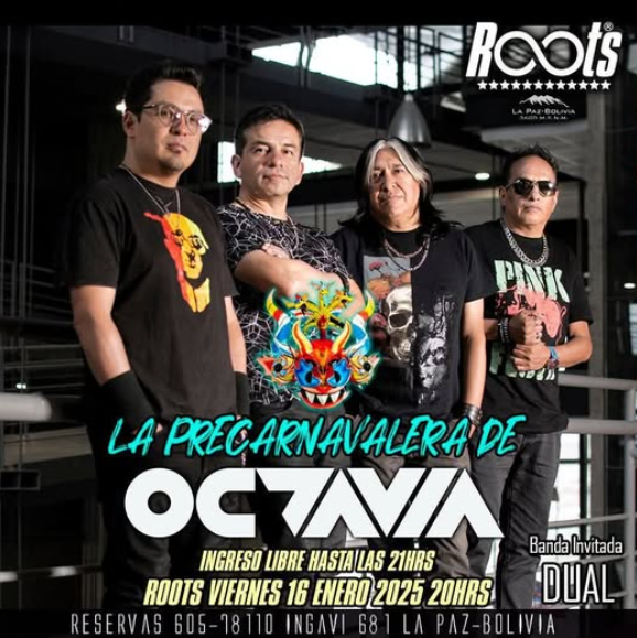 DETALLES DEL EVENTO Preca de Octavia en Roots La banda paceña Octavia se presentará este viernes en una tocada precarnavalera, junto a su invitada, Dual Oficial, además de DJ residentes. Las personas que cumplen años en enero tienen el ingreso gratis. MÁS INFORMACIÓN ETIQUETAS concierto, rock INFORMACIÓN DEL EVENTO Roots https://wa.me/59160578110 https://www.instagram.com/octaviabo/?e=da52301a-0306-44f3-a8f7-a489997dd6b5&g=5 COSTO Bs 80 desde las 21:00 FECHA 16/01/2026 − HORA 20:00 − UBICACIÓN Ingavi 681 Guarda este evento en tu calendario. GOOGLE CALENDAR MÁS INFORMACIÓN ETIQUETAS concierto, rock Comparte este evento con tus contactos