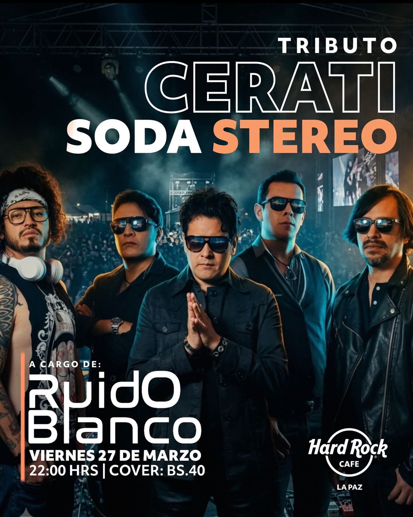 Una noche cargada de nostalgia, energía y puro rock que invita a revivir himnos inolvidables. Las guitarras, las luces y ese sonido que eriza la piel se apoderan del escenario en un tributo a Soda Stereo y Gustavo Cerati, donde cada canción se convierte en un viaje directo a la emoción. A cargo de Ruido Blanco, la velada promete una experiencia intensa para cantar a todo pulmón, conectar con los clásicos y vibrar con un repertorio que marcó generaciones.