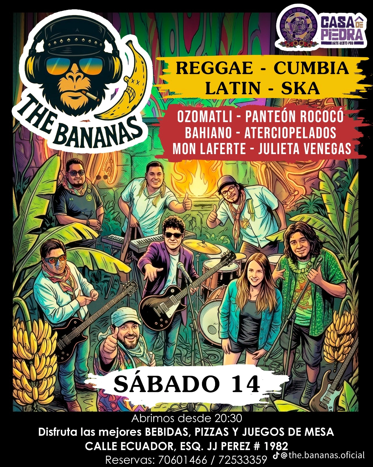 La banda The Bananas se presentará en vivo con una noche llena de ritmos latinos que mezclan reggae, cumbia y ska. El concierto promete una velada bailable con música en vivo y un ambiente festivo para disfrutar en comunidad.