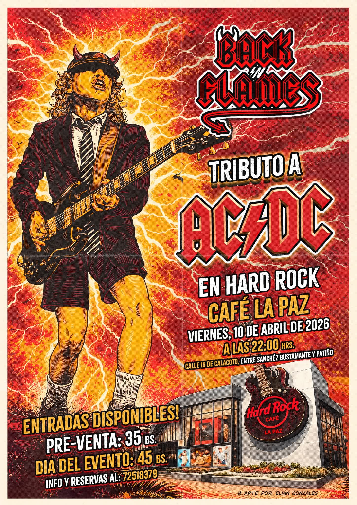 Concierto de rock en vivo con un potente tributo a AC/DC, interpretando sus mayores éxitos en una noche llena de energía y clásicos del género. Una propuesta ideal para los amantes del rock que buscan revivir los himnos más icónicos en un ambiente vibrante.