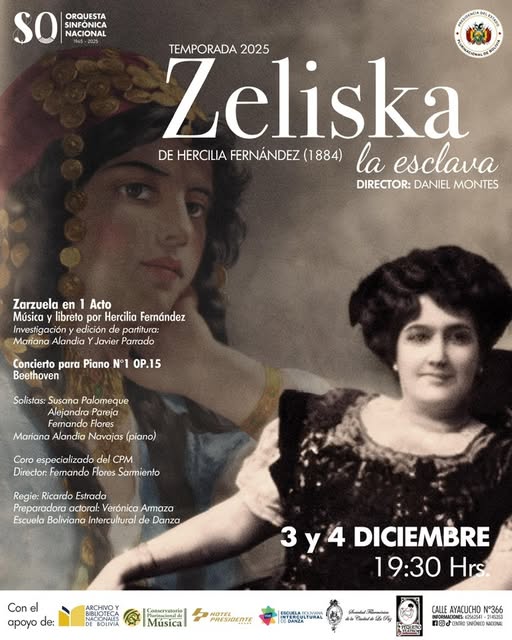La Orquesta Sinfónica Nacional de Bolivia presentará el estreno mundial de la primera ópera dramática boliviana, compuesta en 1884 por Hercilia Fernández de Mujía, pionera en creación musical. Complementa el programa una obra maestra del repertorio universal, el Concierto Nº 1 para piano y orquesta, de Ludwig van Beethoven.