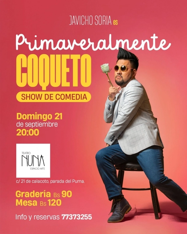 DETALLES DEL EVENTO Javicho Soria presenta: primaveralmente coqueto Javicho presenta su especial «primaveralmente coqueto», con humor ácido sobre algunas particularidades de los nueve departamentos. Precio de las entradas: mesa: Bs 120, gradería: Bs 90. MÁS INFORMACIÓN 77373255 ETIQUETAS comedia INFORMACIÓN DEL EVENTO Teatro Nuna Espacio Arte https://www.nunaespacioarte.com/ https://www.facebook.com/nunaespacioarte https://www.instagram.com/teatronuna/ COSTO Desde Bs 90 FECHA 21/09/2025 − HORA 20:00 − UBICACIÓN Calle 21 de Calacoto #8509 (Parada Puma Katari) Guarda este evento en tu calendario. GOOGLE CALENDAR MÁS INFORMACIÓN 77373255 ETIQUETAS comedia Comparte este evento con tus contactos