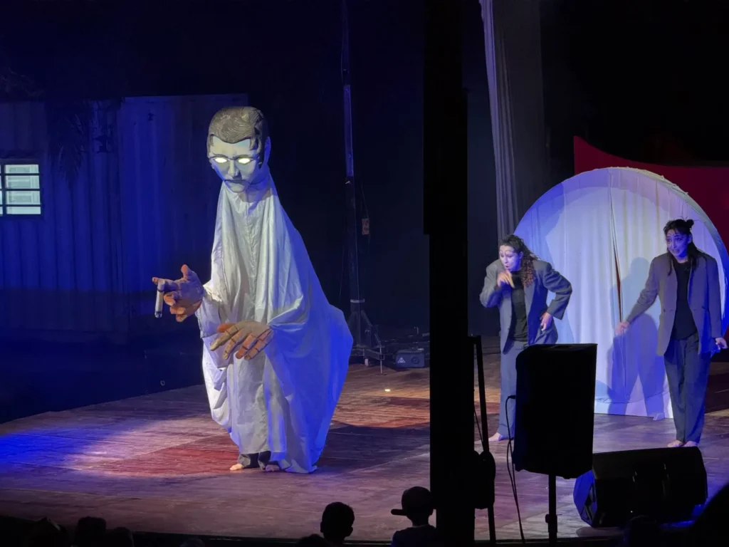 La puesta en escena de Momo es una coreografía de resistencia. Mientras los “Hombres Grises” —interpretados con una frialdad técnica que eriza la piel— intentan convencer a los habitantes de la ciudad de que el tiempo debe ahorrarse como si fuera dinero, los personajes de la compañía defienden la pausa y la escucha atenta. El trabajo corporal eleva la obra a un nivel superior. Es un despliegue de movimiento y energía donde cada gesto está diseñado para alcanzar hasta al espectador sentado en la última fila de pasto, bajo la sombra misteriosa de la noche.