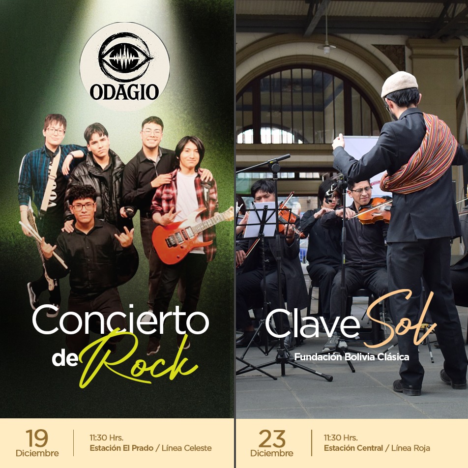 En diciembre las estaciones se convierten en escenarios para todos los gustos. Una agenda que combina la magia de la Navidad con talento nacional. La energía del rock en vivo junto a Odagio, la expresión de la danza contemporánea a cargo de Draga Danza y la armonía de la música clásica y fusión junto a Clave Sol de la Fundación Bolivia Clásica.