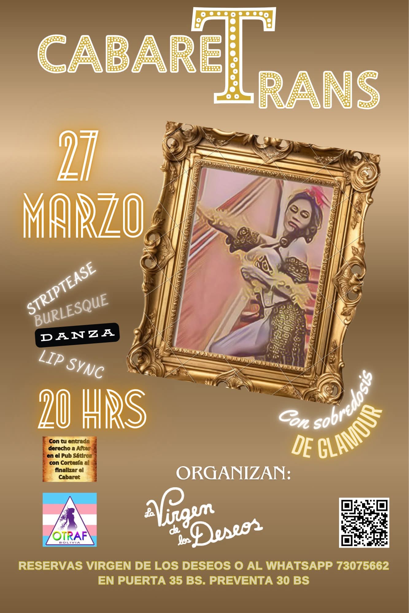 Una noche llena de glamour, expresión y arte escénico. El Cabaret Trans propone una experiencia vibrante donde el escenario se enciende con números de striptease, burlesque, danza y lip sync, celebrando la diversidad y la creatividad en cada presentación. Organizado por La Virgen de los Deseos junto a OTRAF Bolivia, este evento invita a sumergirse en un ambiente festivo y libre, donde el cuerpo, la identidad y el arte se expresan sin límites.