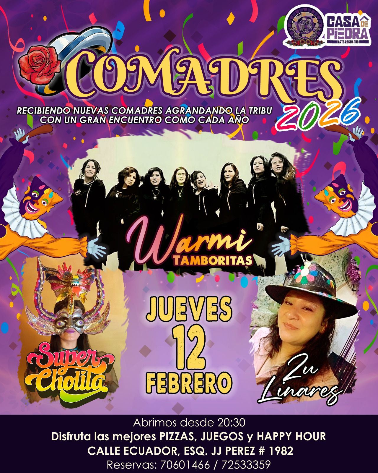 DETALLES DEL EVENTO Comadres 2026 Como cada año, en Casa de Piedra se reúnen las comadres diversas, alegres y musicales. Amenizan: Súper Cholita, desde Cochabamba Warmi Tamboritas Zu Linares Nico Estrella Trae tu canasta y tu comadre. MÁS INFORMACIÓN 70601466 ETIQUETAS carnaval, comadres, fiesta INFORMACIÓN DEL EVENTO Casa Piedra https://www.facebook.com/CasadePiedraStoneHouse COSTO Consultar FECHA 12/02/2026 − HORA 20:00 − UBICACIÓN Ecuador #1982 esquina J.J. Pérez (graditas) Guarda este evento en tu calendario. GOOGLE CALENDAR MÁS INFORMACIÓN 70601466 ETIQUETAS carnaval, comadres, fiesta Comparte este evento con tus contactos