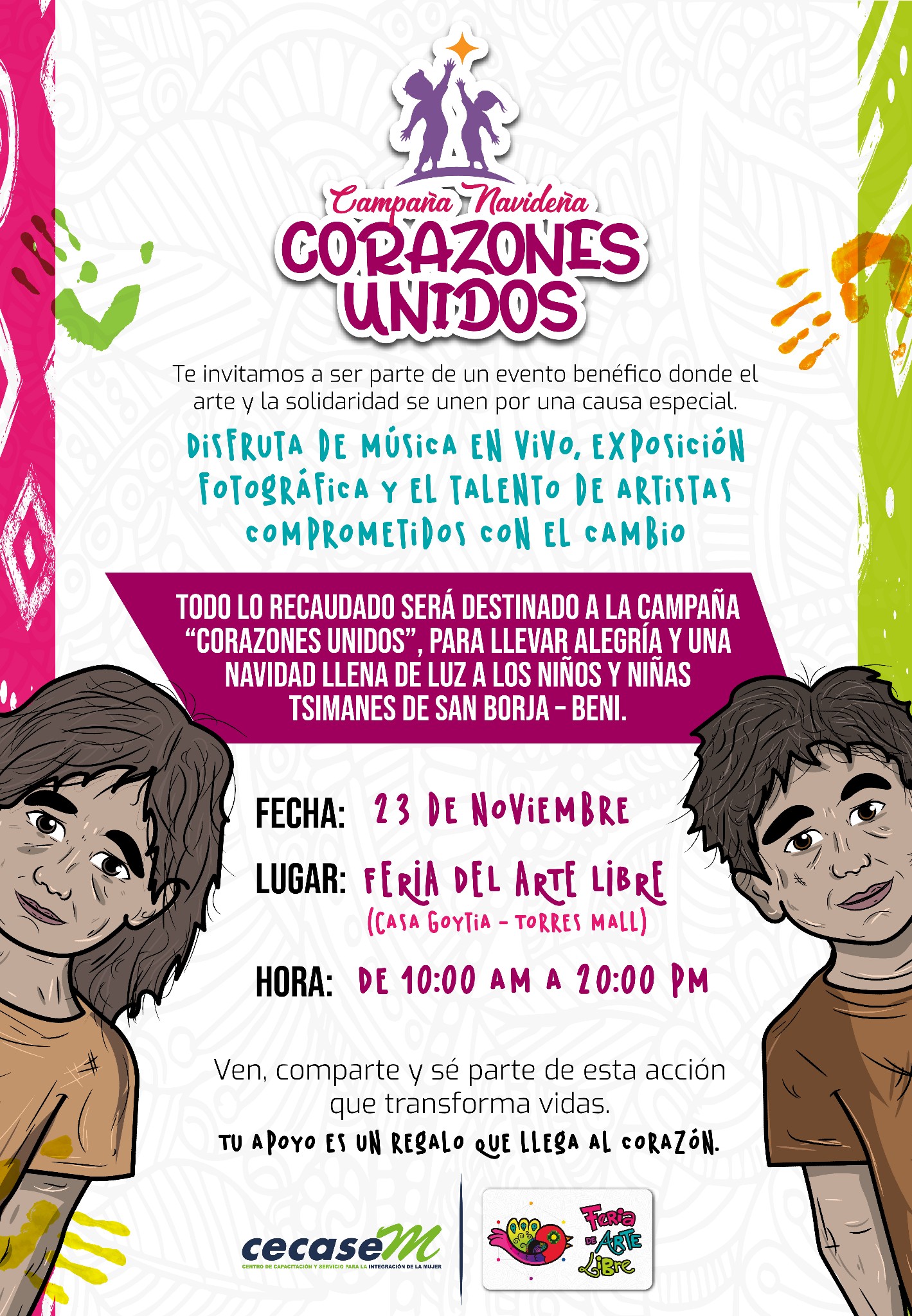 Corazones Unidos es una campaña navideña que busca llevar paquetes escolares a más de 400 niñas y niños Tsimanes de San Borja, Beni. El evento celebra la música, el talento, las oportunidades y la esperanza de cientos de niños, promoviendo la solidaridad y el apoyo a la educación infantil.