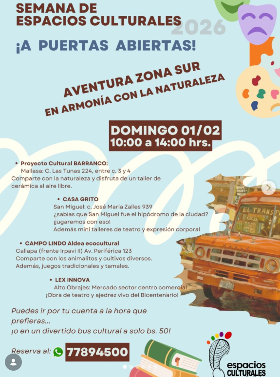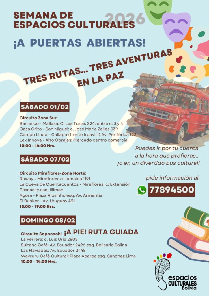 Tres rutas… tres aventuras. Se puede ir por cuenta propia a cualquier hora e ingreso libre o en un divertido bus cultural, a solo Bs 50.- el pasaje incluye refrigerios. Reservas al wasap 77894500.